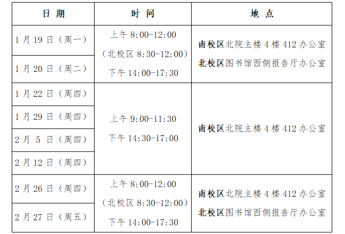 1.应往届生三方协议相关业务、学校毕业生就业推荐表盖章,南、北校区值班时间均可办理;